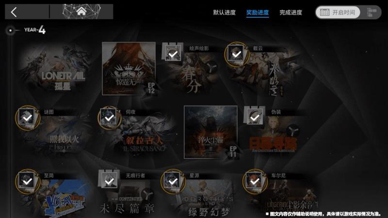曲谱系统将这些内容重新分类为多个乐章,以多条故事线的形式展开展示。乐章内的章节按照时间顺序排列,博士们能够清晰地看到故事之间的前后关系。通过滑动屏幕可以浏览当前乐章的所有章节,点击左侧按钮则能重新选择其他乐章。