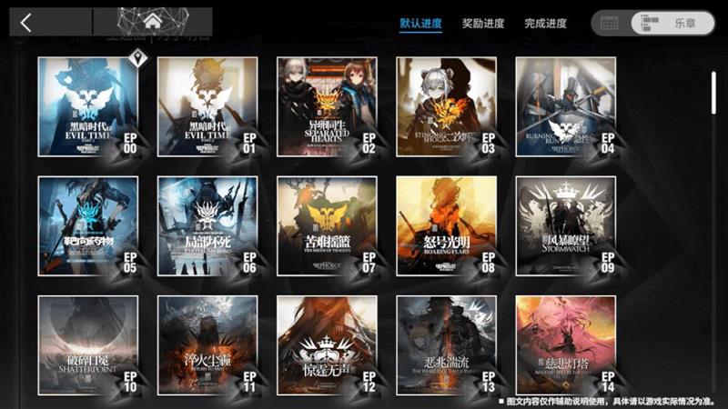 此外,点击乐章收录按钮还能查看所有已被收录的章节,博士们可以根据章节开启时间或乐章分类来查看所有章节内容。系统还提供了切换乐章排列顺序的功能,选择奖励进度与完成进度的排列顺序后,博士们可以便捷地查看章节重要奖励及源石获取情况。进入章节后,下方的标签还能帮助博士们快速选择同个乐章内的其他章节。