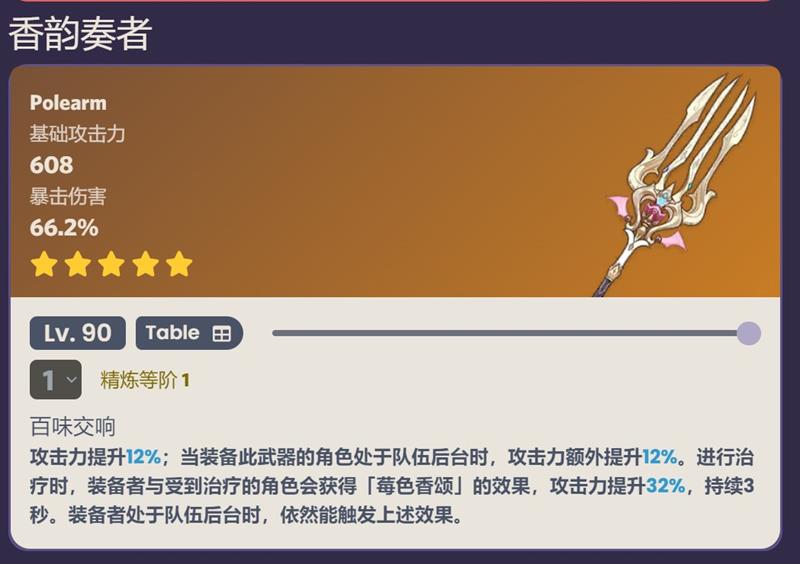 武器特效香韵奏者的武器特效名为“百味交响”,能够为装备者提供显著的攻击力加成。具体来说,装备该武器的角色攻击力会提升12%,若角色处于队伍后台,攻击力还会额外提升12%。更为关键的是,当装备者进行治疗时,无论是装备者还是受到治疗的角色,都会获得“莓色香颂”的效果,攻击力提升32%,持续3秒。值得注意的是,即使装备者处于队伍后台,依然能够触发这一效果。