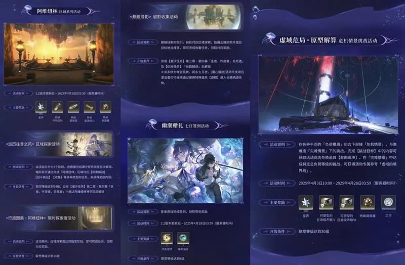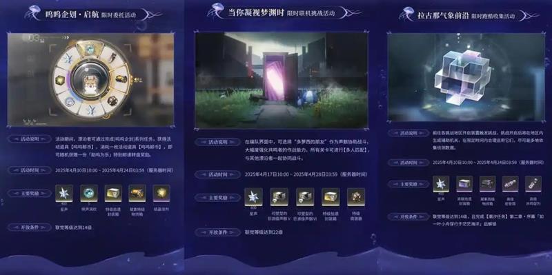 4月活动同样精彩纷呈,10日呜呜企划与拉古那气象前沿上线,完成呜呜企划可获400星声及5颗蓝球,拉古那气象前沿奖励为400星声及其他部分奖励。14日【潮汐觅闻】开启,17日、21日分别有【当你凝视梦渊时】、【回音盈域】活动。