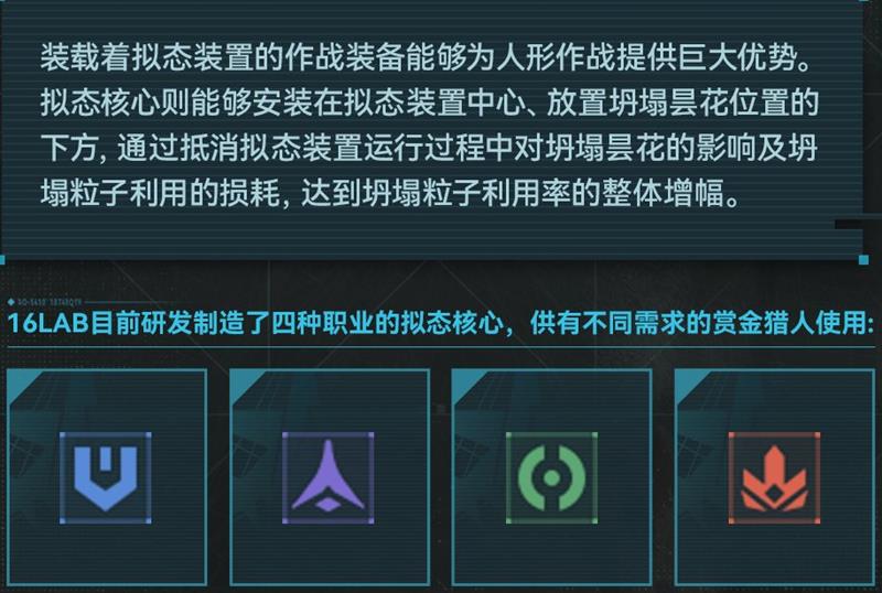 拟态核心安装在拟态装置中心,通过抵消拟态装置运行过程中的影响及坍塌粒子利用的损耗,达到坍塌粒子利用率的整体增幅。目前,16LAB研发制造了四种职业的拟态核心供玩家选择。