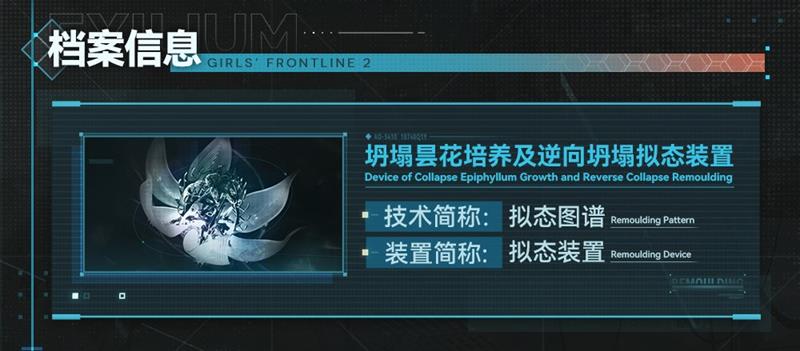 坍塌昙花是一种具有高效储存和释放坍塌粒子特性的植物。在奥尔劳格财团窃取第三代人形技术后,帕斯卡开始研究如何利用这种植物提升二代人形的战力,并成功研发出“坍塌昙花培养及逆向坍塌拟态装置”技术,即“拟态图谱”。
