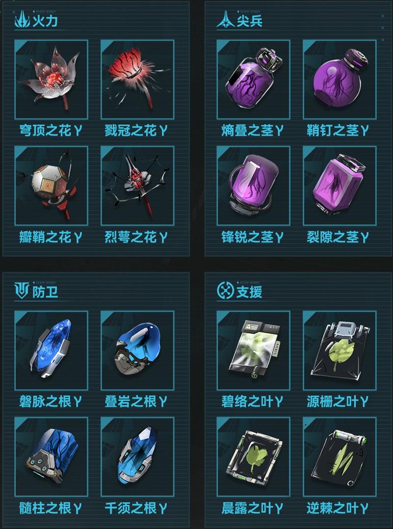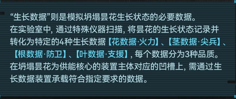 生长数据是模拟坍塌昙花生长状态的必要数据,分为【花数据·火力】、【茎数据·尖兵】、【根数据·防卫】、【叶数据·支援】四种类型,每种数据又分为3种品质。