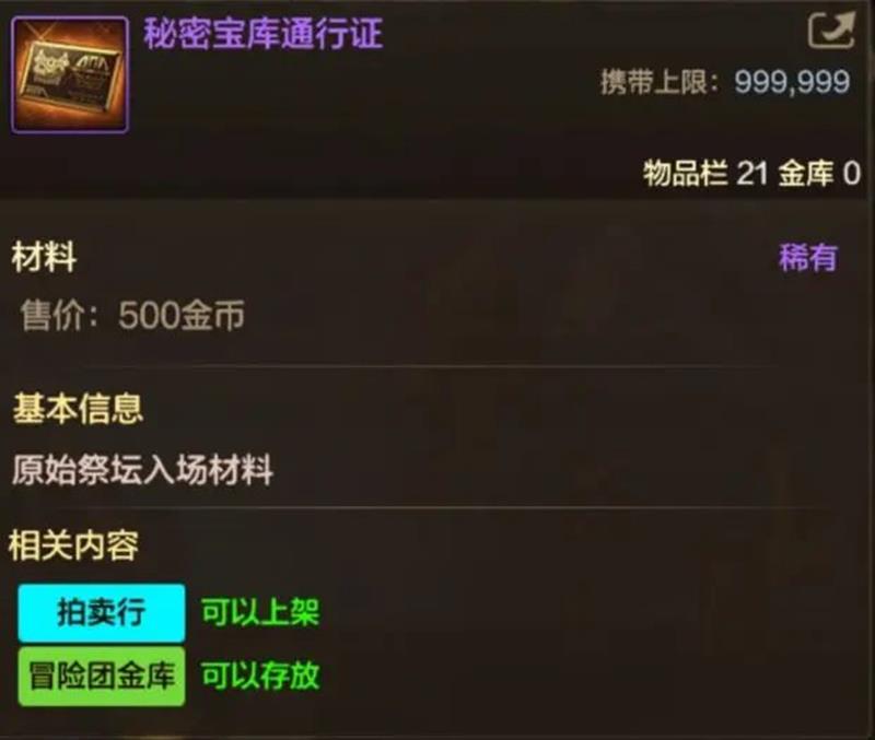 秘密宝库通行证是进入新深渊地下城“原始祭坛”的关键入场材料。冒险者可以通过西部深渊地下城、每周周常地下城以及65级勇士级地下城来获取这一通行证。