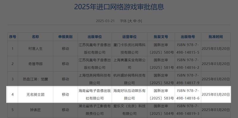 无名骑士团在2025年3月正式获得进口游戏版号。游戏由海南省电子音像出版社有限公司出版,海南好玩互动娱乐有限公司运营,批复文号为国新出审〔2025〕583号,ISBN 978-7-498-14818-6。之后游戏将会正式进入国服的运营阶段。