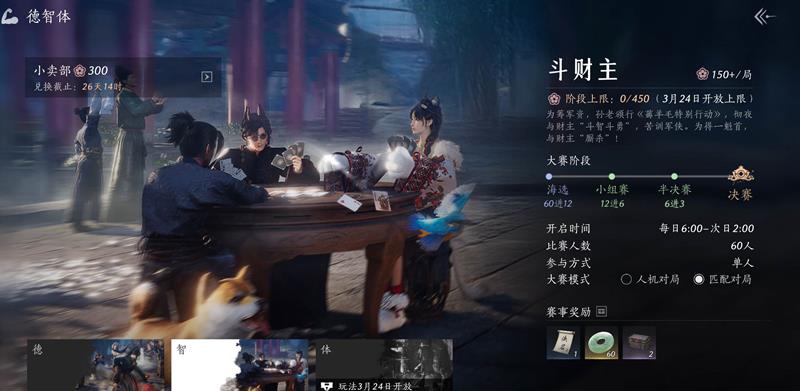 智赛·斗财主:这是一个限时的60人比赛,每天6:00至次日2:00开放,分为海选、小组赛、半决赛和决赛四个阶段。玩家需要通过智慧和策略在比赛中脱颖而出。