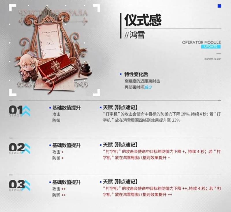 天赋【弱点速记】:“打字机”的攻击会使命中目标的防御力下降++,持续4秒;若“打字机”放在鸿雪周围八格则效果提升++