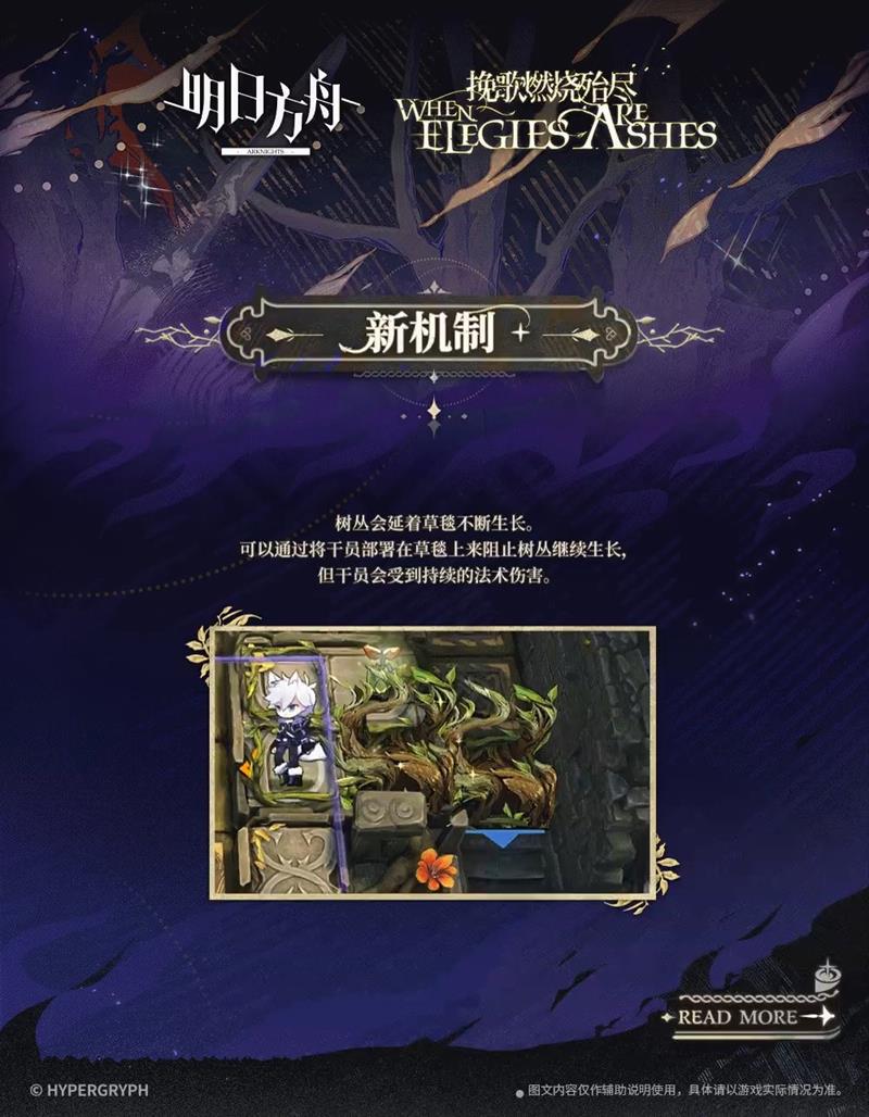 树丛会延着草毯不断生长。可以通过将干员部署在草毯上来阻止树丛继续生长,但干员会受到持续的法术伤害。