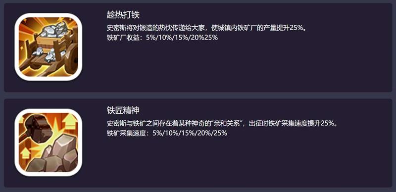【趁热打铁】史密斯将对锻造的热忱传递给大家,使城镇内铁矿厂的产量提升25%。铁矿厂收益:5%/10%/15%/20%/25%。