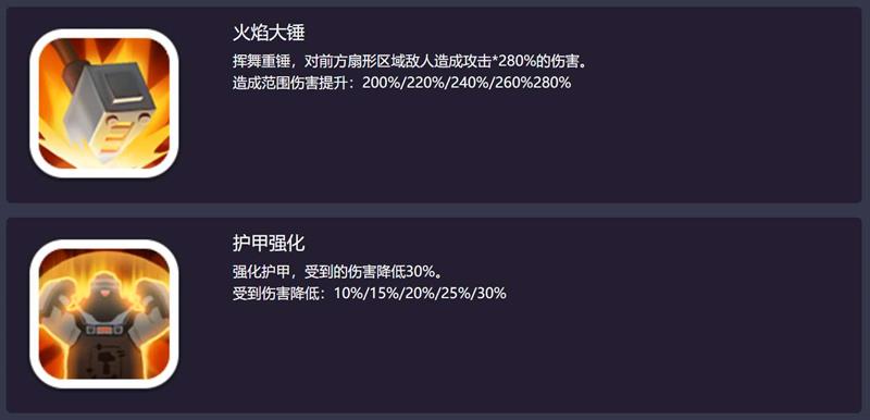 【火焰大锤】挥舞重锤,对前方扇形区域敌人造成攻击*280%的伤害。造成范围伤害提升:200%/220%/240%/260%/280%;
