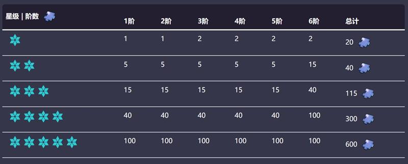 星级 | 阶数 1阶2阶3阶4阶5阶6阶总计1星11222220 2星555551540 3星151515151540115 4星4040404040100300 5星100100100100100100600