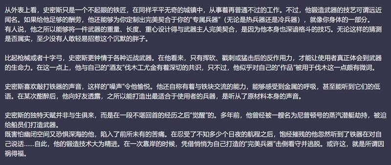 从外表上看,史密斯只是一个不起眼的铁匠,在同样平平无奇的城镇中,从事着再普通不过的工作。不过,他锻造武器的技艺可谓远近闻名。如果给他足够的酬劳,他还能够为你定制出完美契合于你的“专属兵器”(无论是热兵器还是冷兵器),就像你身体的一部分。