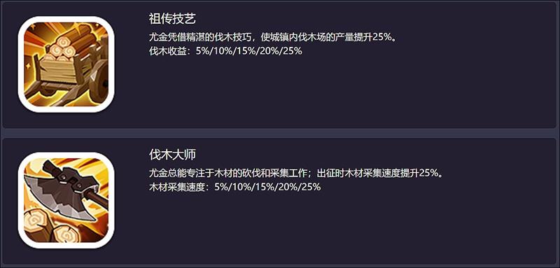 【伐木大师】尤金总能专注于木材的砍伐和采集工作;出征时木材采集速度提升25%。木材采集速度:5%/10%/15%/20%/25%。