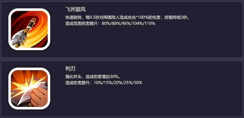 【飞斧旋风】快速旋转,每0.5秒对周围敌人造成攻击*100%的伤害,技能持续3秒。造成范围伤害提升:80%/88%/96%/104%/110%;