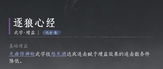 逐狼心经与九剑的契合度极高。其6重突破不仅减少了技能段数需求(例如将12段的强劲江流减少到10段),还显著提升了buff的持续时间和会意率及会意伤害。25%的气血增伤和5%的易伤加成,使得九剑在战斗中更具优势。此外,逐狼心经的buff效果可以持续不间断,完美契合九剑的战斗节奏,是九剑流派的最佳搭配之一。
