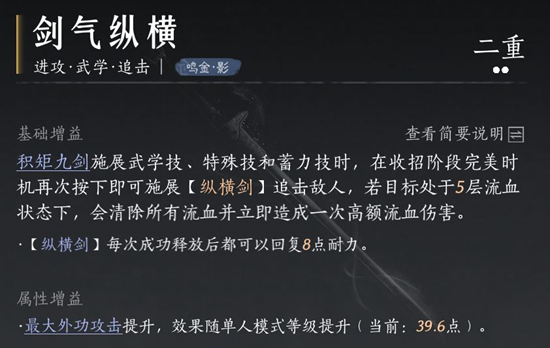剑气纵横是九剑流派的核心心法,其6重突破带来的增益效果对九剑的输出提升极为显著。无论是提升剑气的伤害,还是增加剑气的段数,都能显著增强九剑的爆发能力。不带剑气纵横,就等于失去了九剑的灵魂,因此这是九剑流派的必带心法。