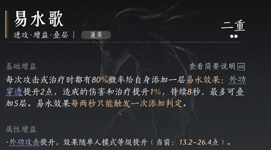 移经易武的心法突破效果较为复杂,但其2、5、6重突破对九剑的提升较为显著。2重突破增加易武技30%的伤害,虽然看似不高,但在实战中也能带来一定的输出提升。5重突破的易武技加速和减速效果,可以在战斗中提供一定的辅助作用。6重突破的12.5%无视外功防御,对于九剑的输出提升也有一定的帮助。尽管移经易武的整体效果不如前三者显著,但其多方面的能力提升使其成为一个不错的补充选择。