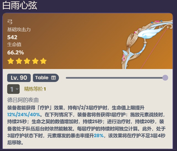 白雨心弦(专武)——生命值加成最高,最佳治疗和副C选择。终末嗟叹之诗——充能和团队增益兼顾,适合辅助型玩法。祭礼弓——技能冷却刷新,提高战技频率,适合治疗辅助流派。反曲弓——平民向神器,提供生命值加成,极大提升治疗能力。西风猎弓——充能支持,适合队伍整体循环优化。若水(6命专用)——高命速切副C(打输出)向玩法可选。