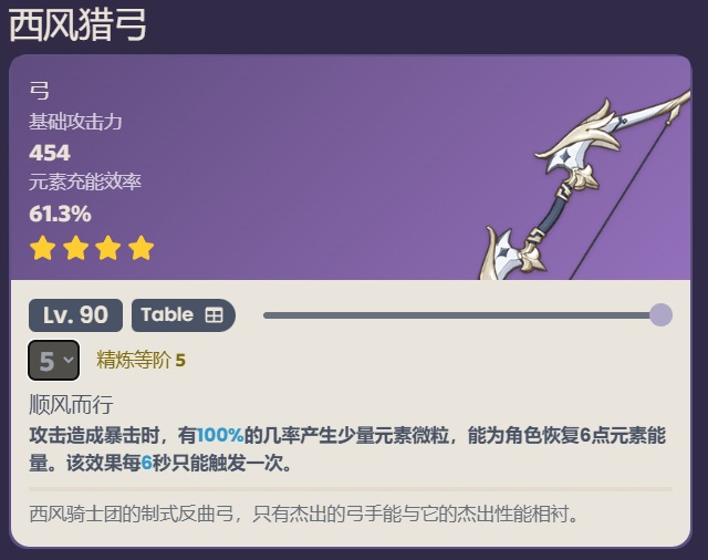 西风猎弓——充能效率与团队辅助 西风猎弓的副属性提供充能效率,武器特效在暴击时能够生成元素微粒,帮助全队角色加快大招循环。如果你的队伍整体充能需求较高,可以使用西风猎弓来优化希格雯的充能效率。不过,由于希格雯本身不依赖暴击率,这把武器的触发条件可能较难满足,推荐在副词条有暴击率的情况下使用。