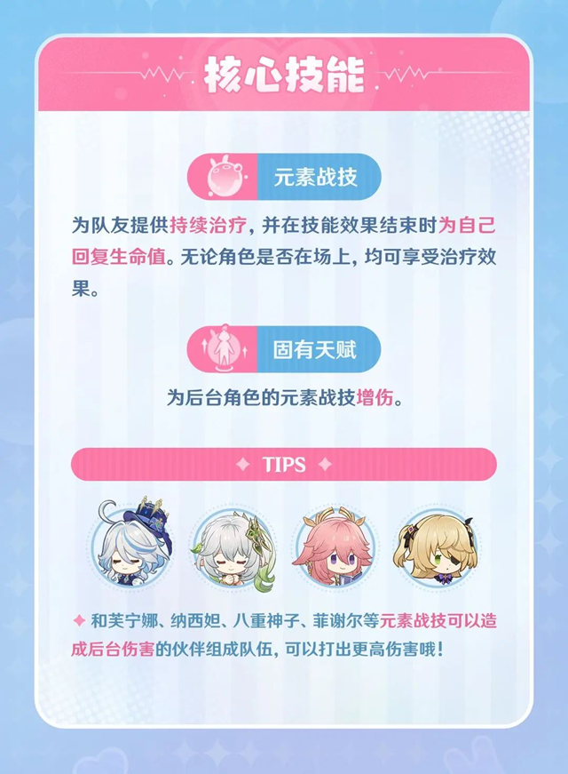 然而,她的水元素附着能力较弱,在破盾和元素反应队伍中的作用有限。同时,她的增伤效果仅限元素战技,无法增强普攻或大招伤害。因此,她更适合在后台战技输出流队伍中担任辅助,而不适用于所有阵容。