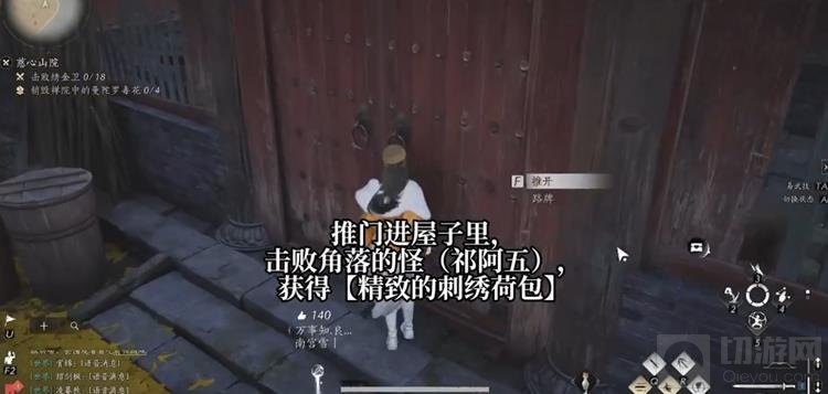 进入屋子击败祁阿五:找到并推开门,进入屋内。在屋子的角落里会遇到一个名为祁阿五的敌人,击败他后可以获得【精致的刺绣荷包】这件重要道具。