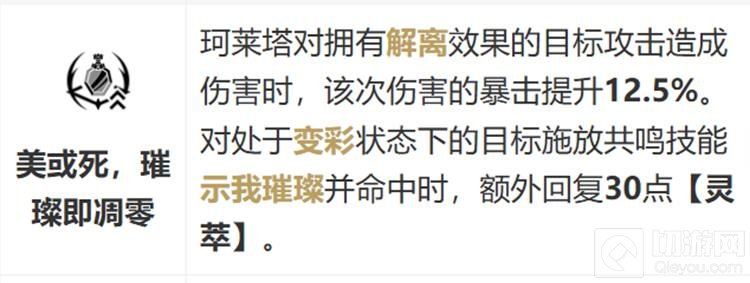效果:珂莱塔对拥有解离效果的目标攻击时,暴击提升12.5%。对处于变彩状态的目标施放共鸣技能【示我璀璨】并命中时,额外回复30点【灵萃】。