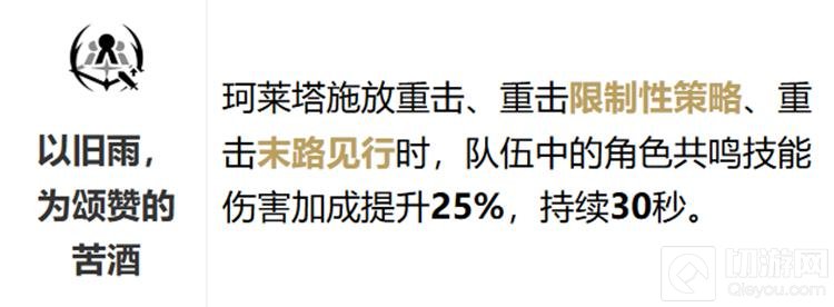 效果:珂莱塔施放重击技能后,附近队伍中的所有角色的共鸣技能伤害加成提升25%,持续30秒。