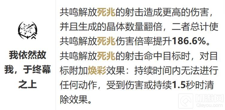 共鸣解放技能【死兆】的射击造成更高伤害,生成的晶体数量翻倍,总计使其伤害倍率提升186.6%。