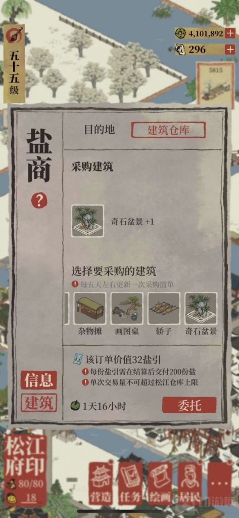 松江盐商如果采购奇石盆景需要32个盐引,也就是6400盐,松江所有仓库升级到极限也到不了6000