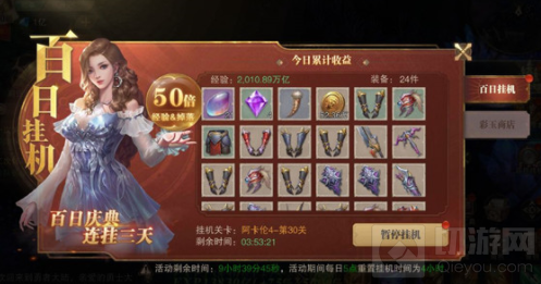 开启百日挂机后将在玩家当前解锁的最高地图最高关卡进入百日挂机状态,享有50倍经验&掉落加成