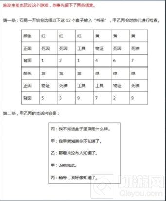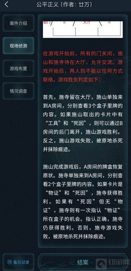 首先,施寺留在大厅,施山单独来到A房间,分别查看3个盒子里牌的内容。如果施山取出的卡片中有“工具”和“死因”,则可以通过B房间的后门离开,施山游戏胜利。反之,施山游戏失败,被原地杀死并抹除痕迹。