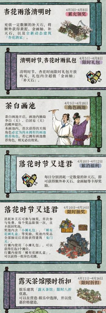 – 【杏花雨落清明时】累充领奖活动,充值一定数额补天石即可额外获得黄泥、金画轴及全新动态建筑【杏花酒家】;