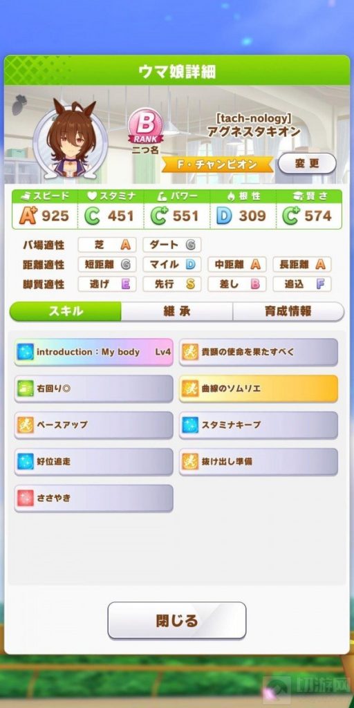 自带的固有技能是最终弯位回体力, 基本技能 好位追走 则是缓和中盘体力消耗, 配上天生的速度训练加成,