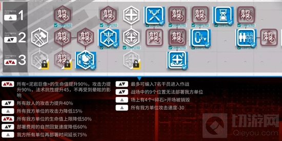 本攻略采取的方式较为常见也相对取巧。点选三级泥岩巨像tag,并放弃最终防线tag,放走两个泥岩巨像(留给博士手撕),在选择了二级加攻,三级降生命的tag情况下,需要尽一切可能避免与敌人接触,利用活性源石与高台的控制输出来尽可能地减少敌方地面干员所带来的威胁。