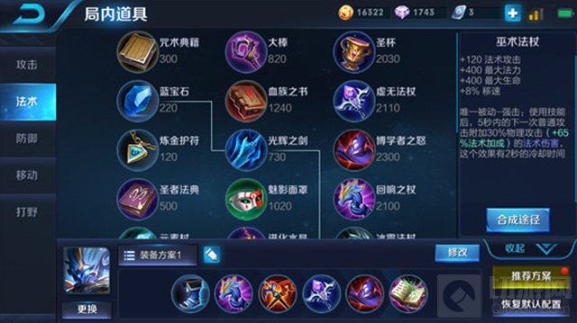 巫术法杖:第三件装备我们选择巫术法杖。移速加成进一步加强钟馗的机动性,生命加成和法力值加成使得钟馗拥有更加持续的线上能力和续航能力。法术加成继续补强钟馗的伤害。我们看中的是巫术法杖的被动效果,使用技能后的下一次普通附加高额的法术伤害,可以真正的让钟馗做到一套技能带走一个敌人。