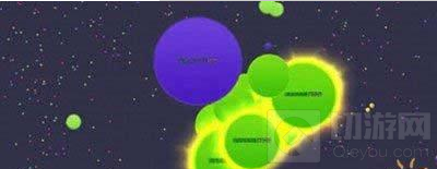 1、这里绿球想要吃紫球,但是分身不够,所以打算要侧涨,先让一个队友靠近紫球,然后自己紧贴队友,要注意控制距离不要在一个直线上,中间的队友要稍微往旁边走一点,不然就白送了。