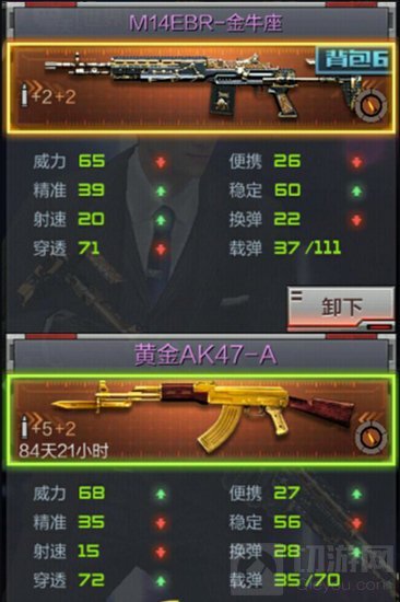 刚比对完M4系列的武器,接下来再看AK系列武器的属性对比。玩过AK武器的应该都知道,该系列武器的最大优势就是伤害比较高,而从这两把武器的对比图上来看,M14EBR-金牛座虽然不如AK,但是也相差不多,而其余的属性则趋近于碾压,足以见得这把武器的可怕。