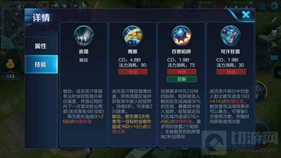 成吉思汗这个英雄有很好的探寻视野的技能,在有草丛的地方才能发挥他最大优势,一技能和二技能都能有效地防止敌人埋伏,成吉思汗没有位移,所以团战需要队友的保护才能打出成吨的物理输出。