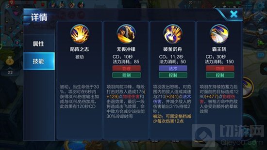 技能解析:被动使得残血项羽具有超强的免伤效果和伤害输出,所以团战时项羽可以放心的为队友吸收伤害,即使是残血时,项羽也可配合队友轻松收割敌方。唯一需要注意的是被动具有一定的CD时间,不要在被动进入冷却后盲目的冲锋。