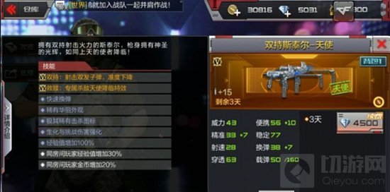 好啦,这就是斯泰尔天使的武器数据和属性了,光看数据的话只是觉得斯泰尔天使在便携,稳定和穿透方面比其他斯泰尔要强力一些,而且载弹也更多了。英雄武器的特殊属性之中有一个很少见的功能“双持”,即射击双发子弹,准度下降。除了这个功能之外其他的就是华丽的特效、经验值和金币加成以及生化挑战伤害强化了。那么这个双持功能开不开启有什么区别呢?或者说开启了双持之后对敌人造成的伤害是多少呢?