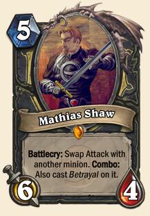 马迪亚斯. 肖尔 (潜行者职业橙) – 战吼: 与另一个随从交换攻击力。连击:同时对该随从释放“背叛”。