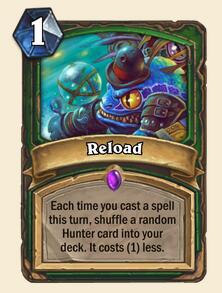 重载 (猎人职业法术紫卡) – 本回合每施放一个法术,便随即将一张猎人的职业卡置于你的牌库中,并使其费用降低(1)点。