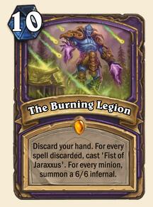 燃烧军团 (术士法术橙) – 丢弃你手中的卡牌,每丢弃一个法术变释放一次“加拉克苏斯之拳”,每丢弃一个随从召唤一个6/6的地狱火。