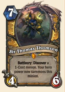 汤姆森 (圣骑士职业橙) – 战吼:发现一个1费的随从,你的英雄技能现在将会召唤这个1费随从。
