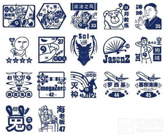 截止于南京站,已经有47位深受欢迎的明星主播和知名选手拥有了专属的印章图案,他们分别是:囚徒、二龙、少帮主、毕游侠、小鱼鱼大仙人、安德罗妮、萌太奇、中华毅力帝、星苏、冰蓝飞狐、李博、王师傅、温酒斩华佗、超老板、秋日、斯佑天、弱鸡、好学生张博、贪睡之萨满、CLBreath、毛毛、雪妍、不二、衣锦夜行、爱陈潇、瓦莉拉、明天不见、啦啦啦、Nami、BBC、小易、绯夜千雪、魔法之风、邦教练、涛妹、刘飞儿、两仪未娜丶、Sol君、Jasonzhou、狗贼、鬼鬼、OmegaZero、灭神、罗西基、慕容清清、雪兔、海老板。
