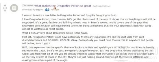 “我太爱龙息药水了,因为很明显,暴雪爸爸这么安排就是要加强控制/龙牧,它是一张及其灵活还能满足牧师基本需要的牌,而且它还能替代极恶之咒这个小贱人的位置(往别人牌库里塞牌算什么牧师!)。