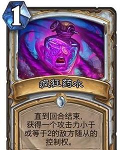 疯狂药水:1费,本回合内获得敌人1个2攻以下随从控制权(吐槽一下这牌以及4费狂乱的描述和10费精控描述一模一样,但是这些拉过来的都可以本回合内攻击,精控的则不能)。1费上限解22+32,赚1牌赚3费,如果拉过来的22有亡语则更强。4费狂乱哭晕在厕所,但其实不灵活的解牌是很要减分的,具体强不强需要看环境内低攻多不多(古神刚开的时候环境内一堆带426的瓦王战,科多表示很开心)。以往的牧师经常看着一堆4攻爹干瞪眼,卡着一手痛灭狂乱白富美环10费空过,而这个法术依然没有解决这个问题。
