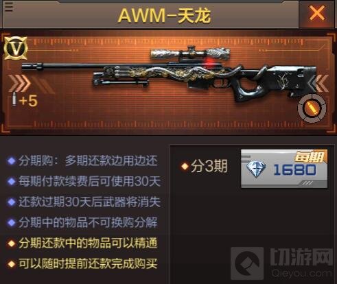 AWM天龙是CF手游中的一把英雄级狙击枪,很受枪手们的欢迎,那么这把枪需要多少钻石呢?分期购买怎么样呢?先就给大家解析一下这把枪的价格,一起来看看吧。