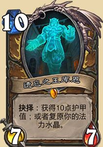 炉石传说遗忘之王库恩卡牌效果:抉择,获得10点护甲值或者复原你的法力水晶。来自龙争虎斗加基森系列拓展包。