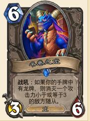 书呆龙:3/6龙在对当今环境下是很好用的解场手段,无论是强大的打3/4图腾魔像,还是躲在后面的火舌以及马桶。对阵战士时候战士的苦痛。面对奥秘猎对面站在面前的3/4女猎手,在面对德鲁伊时,对面的鹿盔。这些有威胁的高血量随从,都是在我们的针对范围。实际使用的效果很棒。